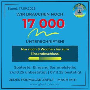 Newsletter von G9 jetzt! BW vom 18.09.2025 | Liebe Unterstützer, 📢 Wir hatten uns die Deadline für unbestätigte Formblätter auf den 20.9.2025 gesetzt gehabt, um dann mit dem Sortieren und Versenden an die Ämter zu beginnen. Doch wir können nicht beginnen, denn es fehlt nach wie vor eine dramatisch hohe Zahl an Unterschriften, nämlich etwa 17000. Wir müssen sagen: unser Volksantrag droht … Weiterlesen